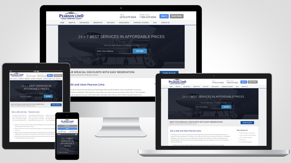Pearson Limo Airport is a leading limousine service provider in Toronto, Canada. Their website is designed with super responsive interface and developed with online reservation, rate lookup systems and It comes with customer admin panel, secure login for easy reservation and making online payments.